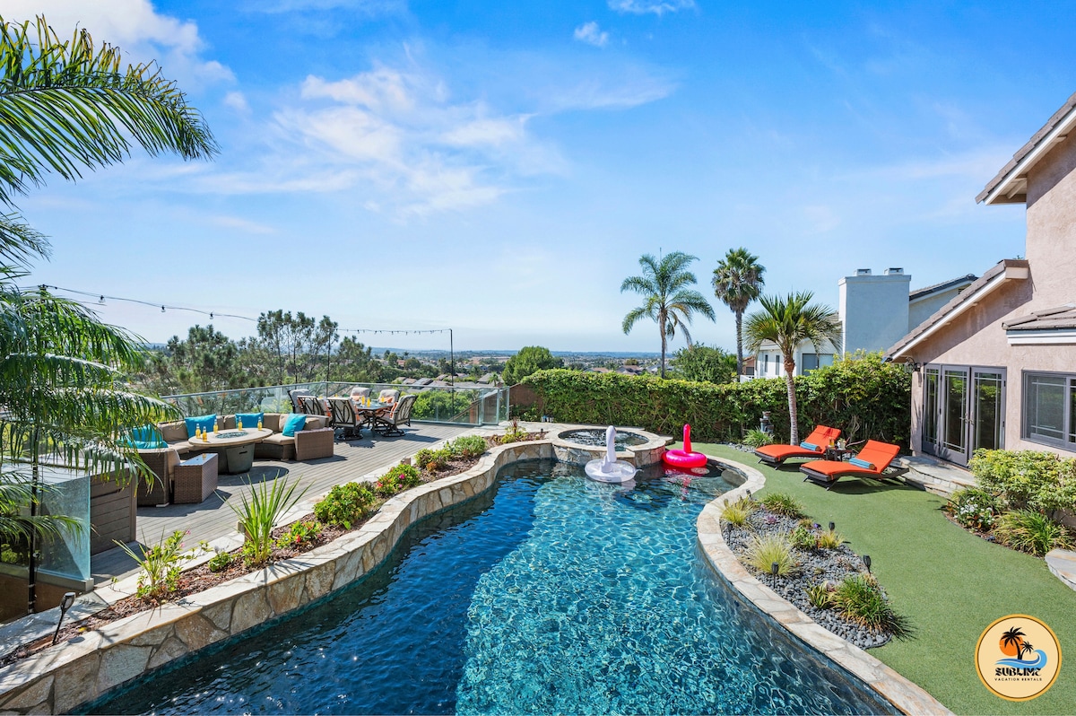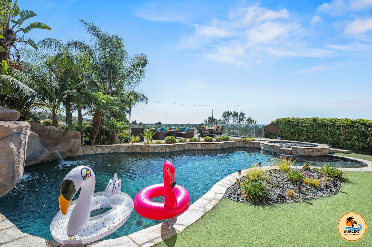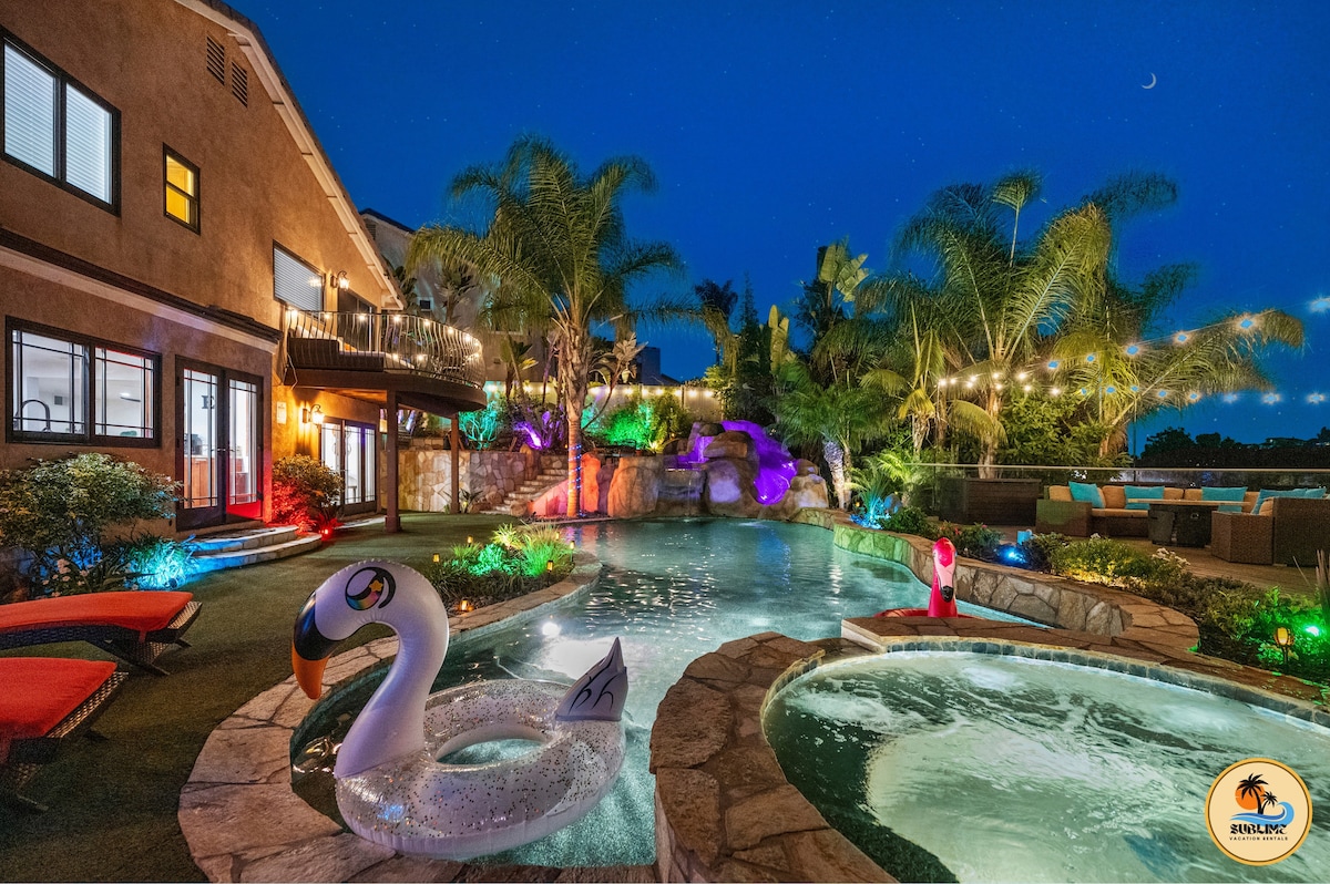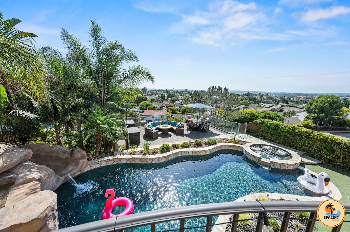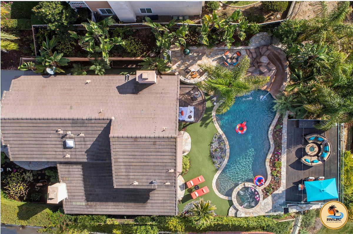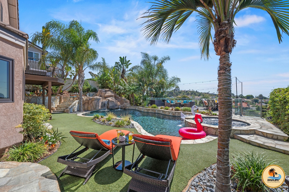 San DiegoSet in the peaceful hills of Rancho Peñasquitos, this spacious, zen-inspired home is made for unwinding. Enjoy the pool, slide, and west-facing views while dining outdoors. Inside, the open layout invites connection, perfect for games, laughter, or laid-back lounging. As evening sets in, relax in the spa or sip a drink on the veranda while the city lights twinkle below. Retreat to any of the 5 bedrooms at night for a peaceful sleep. It’s the ideal space to recharge, reconnect, and feel at home!